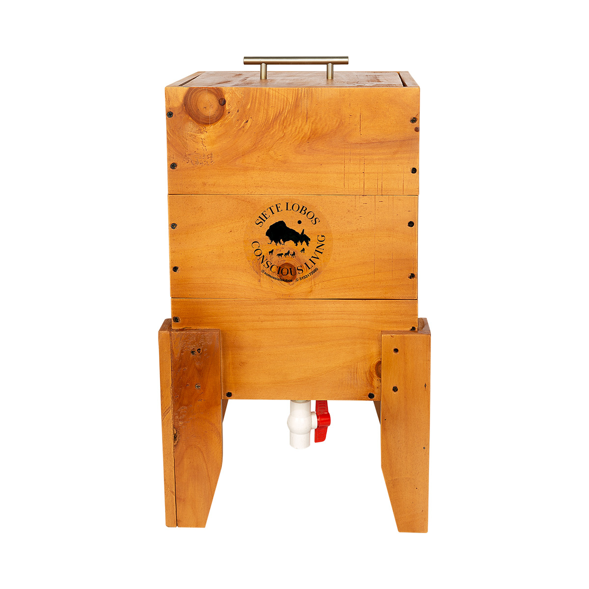 Compostera en madera, tres cajones independientes, incluye llave salida de lixiviado. Adicional viene con bolsa de secos que ayuda en el proceso de compostaje. 59,5cm x 36,5 cms x 36,5 cms